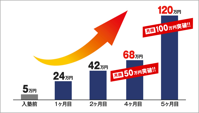 その後も順調に売り上げアップを続け、4か月目には大台の50万円突破、そして5ヶ月目にはなんと120万円まで月商がアップしました。口座期間中に、なんと115万円月商アップに成功できたのです。あなたも、入塾後にはこんな未来が待っています。