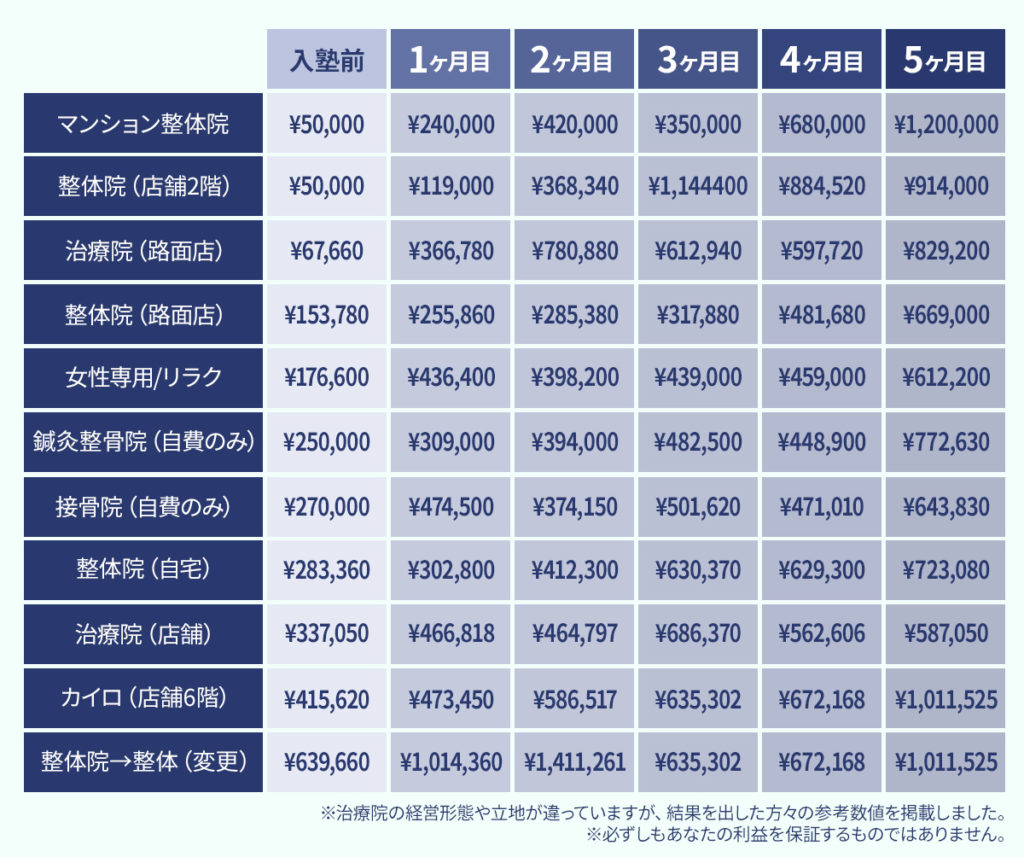 参考例の先生は、入塾前の月商はなんと5万円と悲惨な状況でした。それが、1ヶ月目にコミュニケーションとトークスクリプトを学んだことでリピートが取れるようになり、即24万円に!